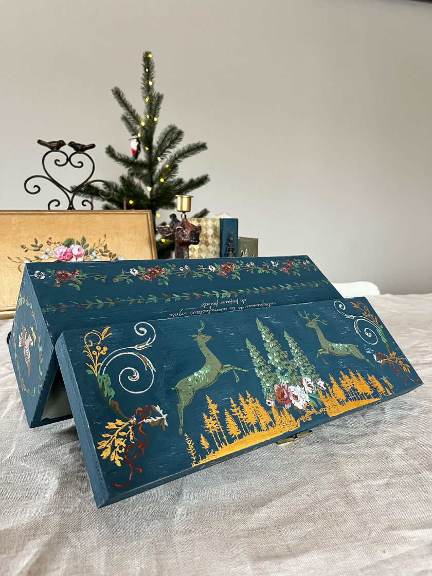 💙 An old wine box, now transformed into a timeless treasure. Inspired by old French manors, winter greenery, and woodland tales—where flowers, birds, and deer quietly live in painted layers. 🎄🕊️🦌
